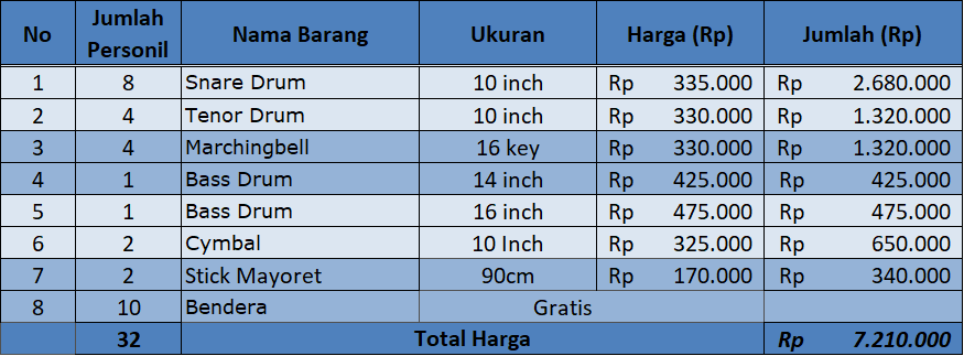 Kami telah dipercaya sebagai penyedia peralatan drumband dari TK, SD, SMP hingga SMA, kini giliran Anda!!
